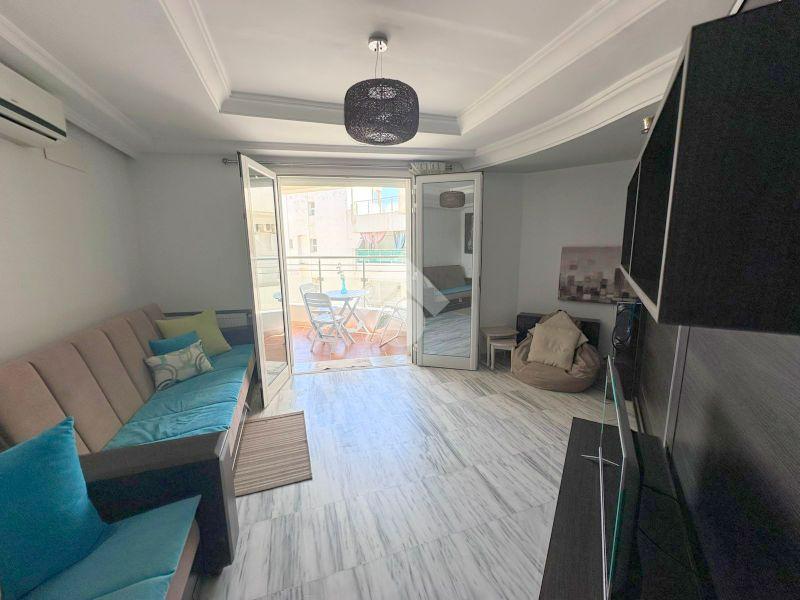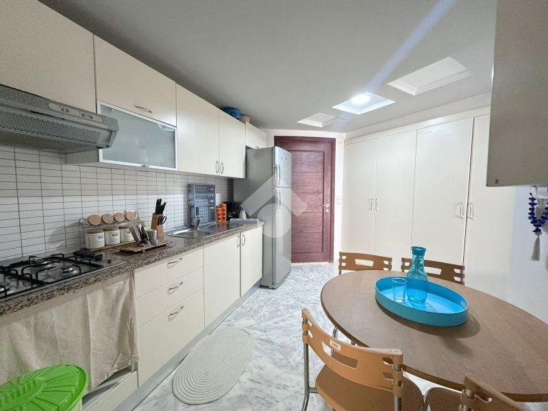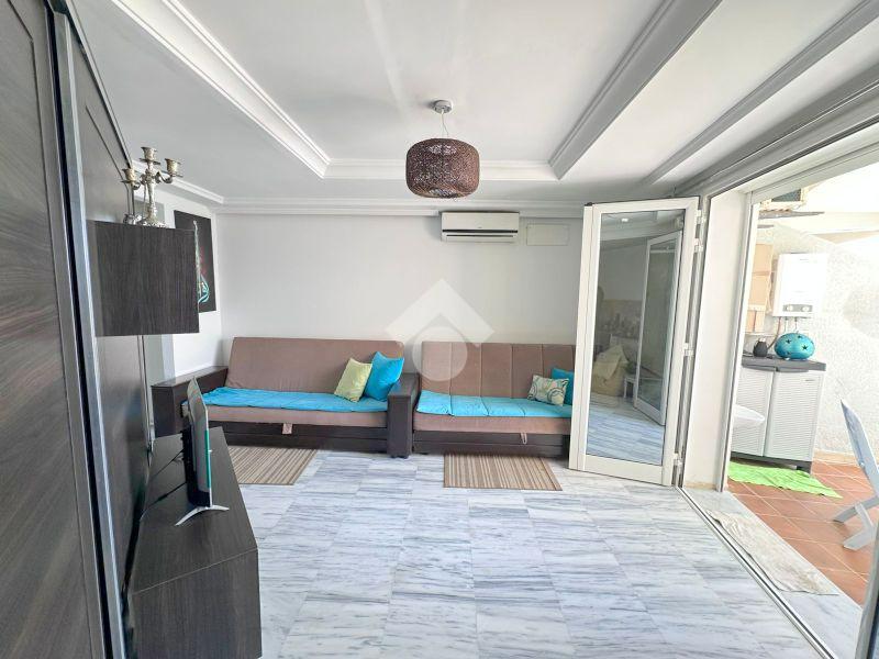 Le salon spacieux s’ouvre sur une cuisine américaine et donne un accès direct à la terrasse, offrant une vue sur la mer.