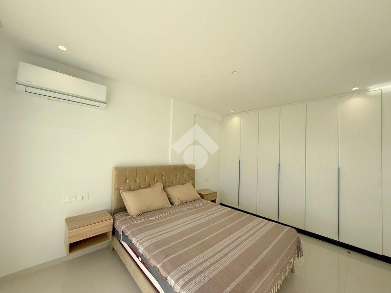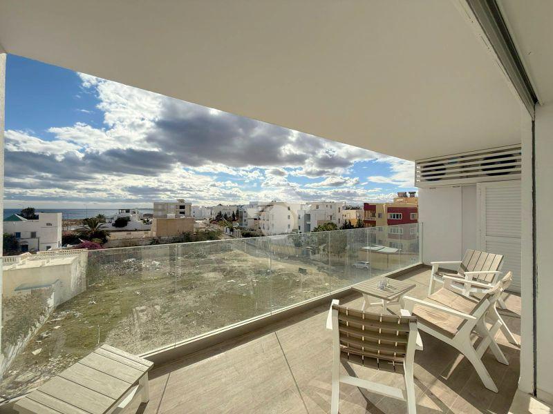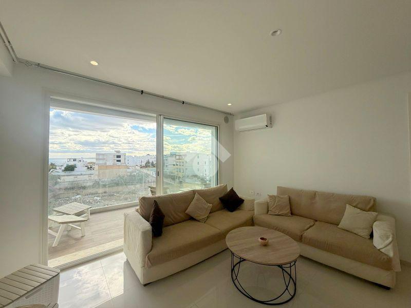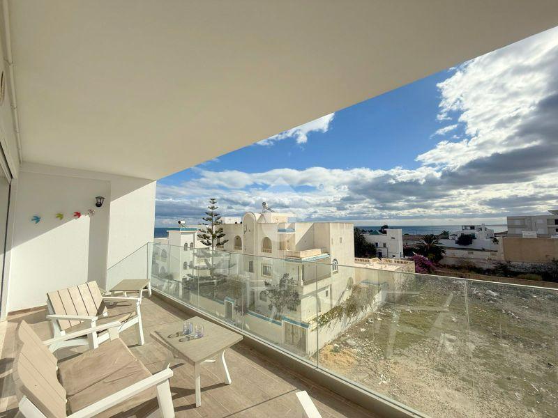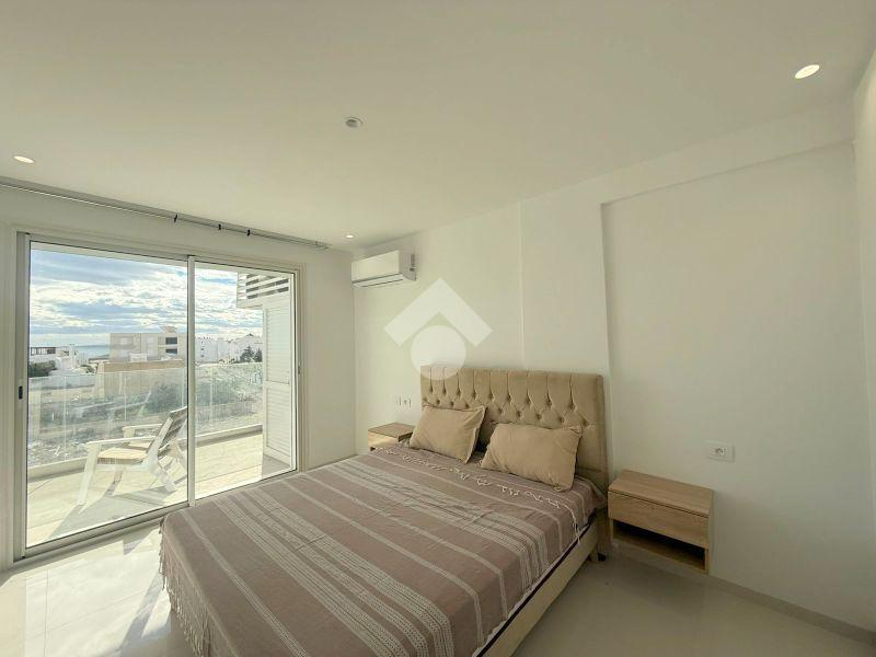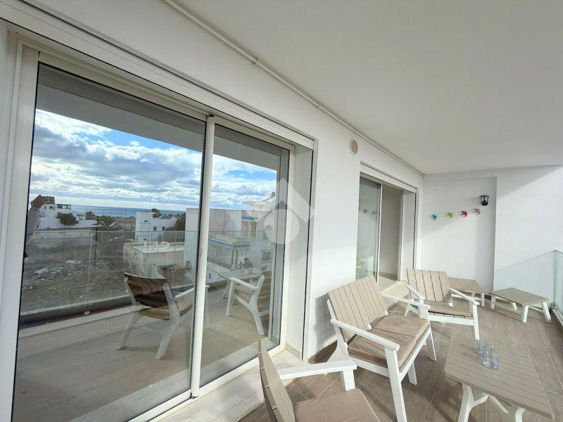 À l’entrée, vous découvrez un salon lumineux avec accès à une terrasse filante qui s’étend entre le salon et la chambre à coucher, permettant de profiter pleinement de l’extérieur et de la vue dégagée sur mer .