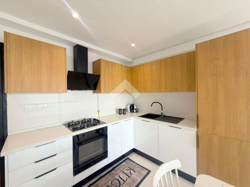 La cuisine ouverte, entièrement équipée et totalement encastrée, offre un espace moderne et fonctionnel.