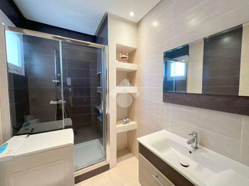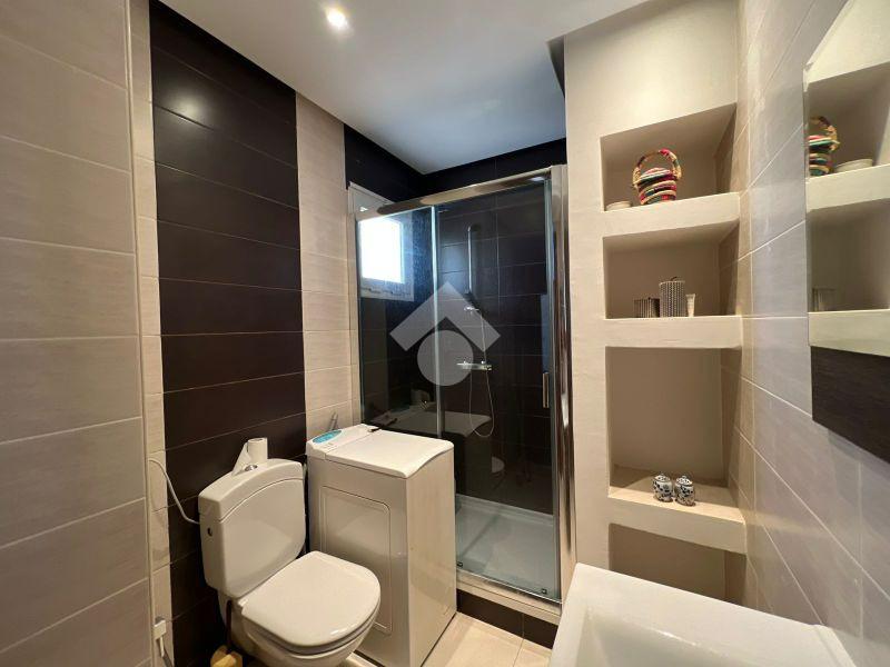 La salle de bain est pourvue d’une cabine de douche et bénéficie d’une aération naturelle.