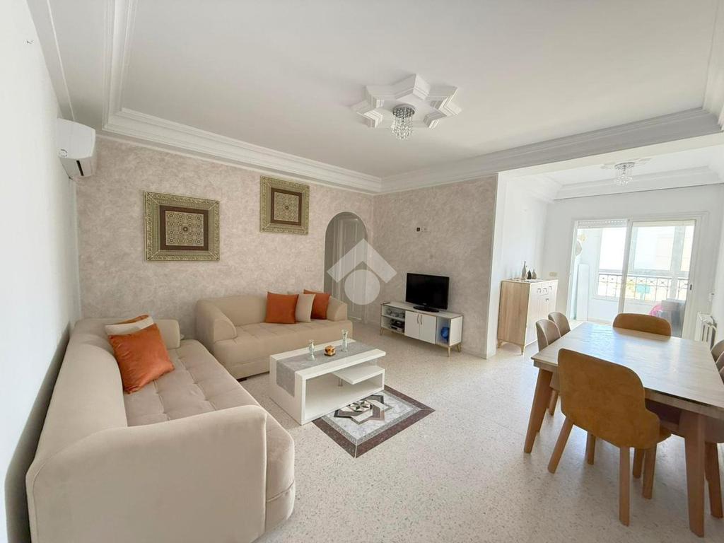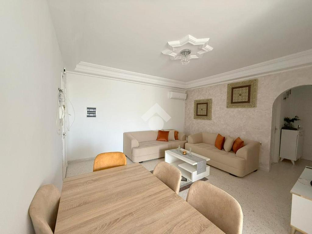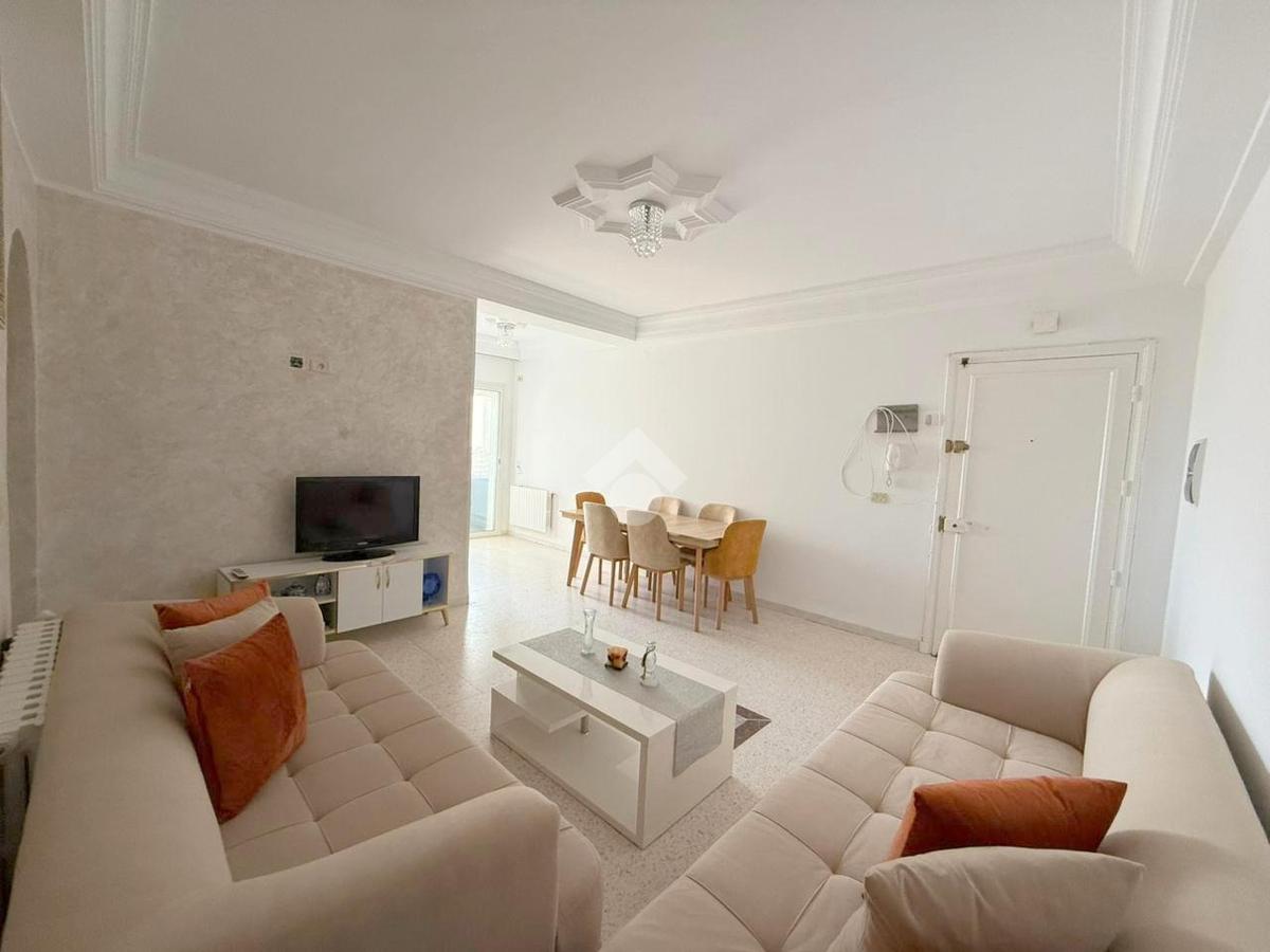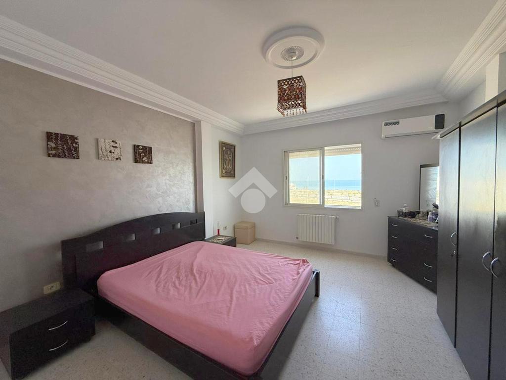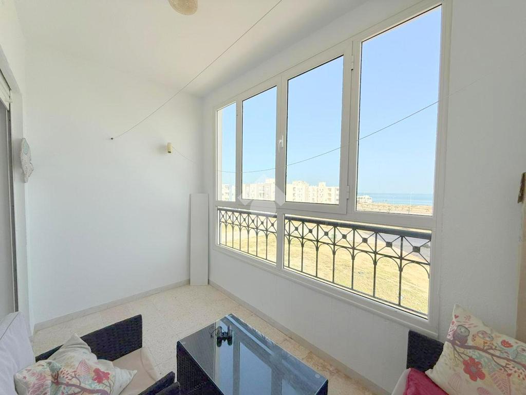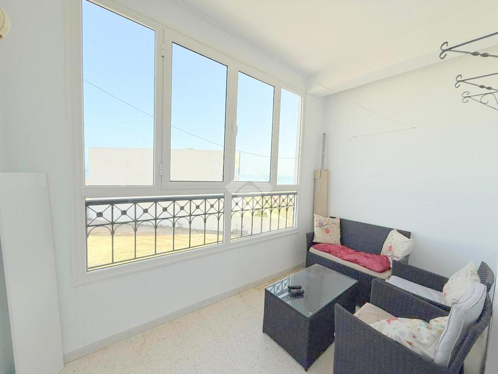 L’entrée donne sur un salon lumineux grâce à son accès à une terrasse fermée offrant une vue sur mer, avec une orientation Est.