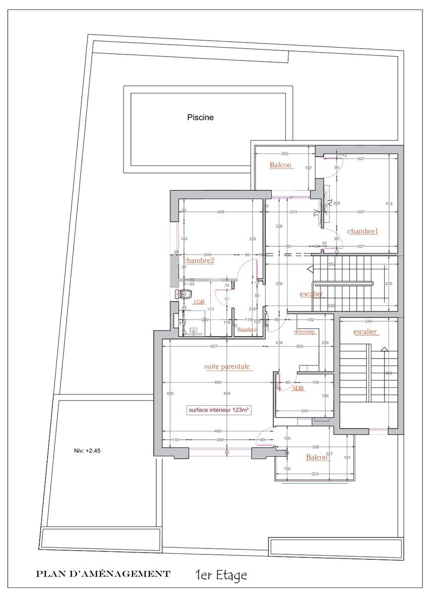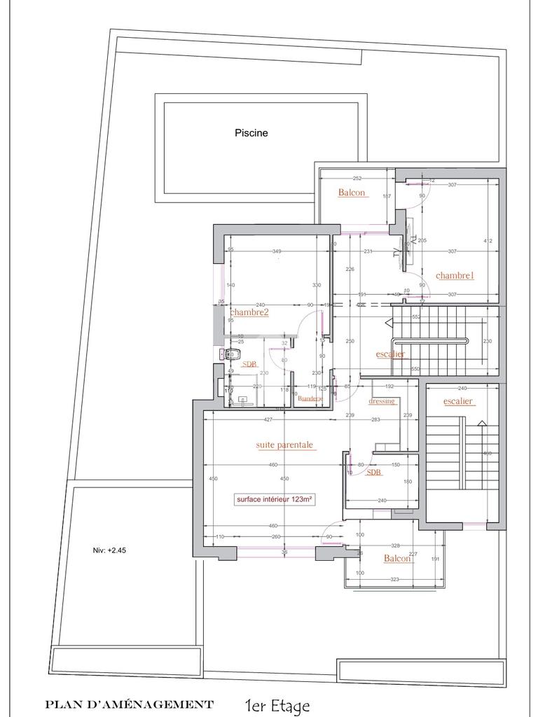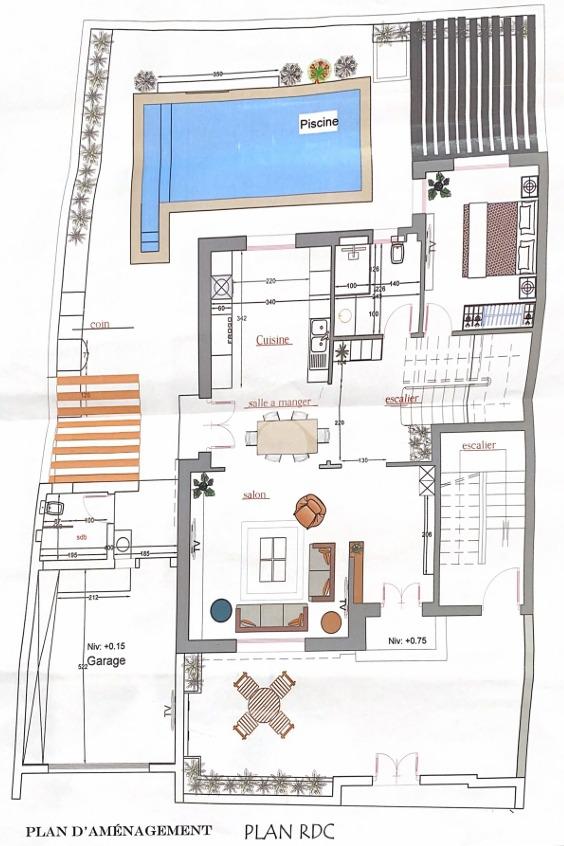 Au rez-de-chaussée, l’entrée s’ouvre sur un espace extérieur pouvant accueillir une terrasse avec pergola, un salon lumineux donnant sur l’extérieur avec piscine, ainsi qu’une cuisine semi-ouverte. Une chambre et une salle d’eau pour les invités complètent ce niveau.
